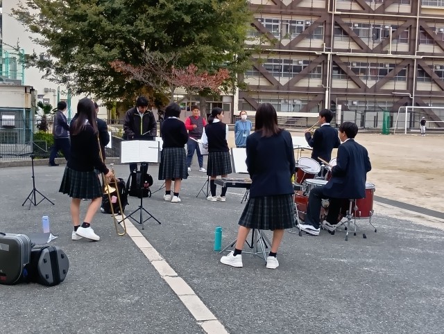 グラウンドの方から楽器の音がするので外に出てみると、四条フェスに向けて吹奏楽部が練習していました。