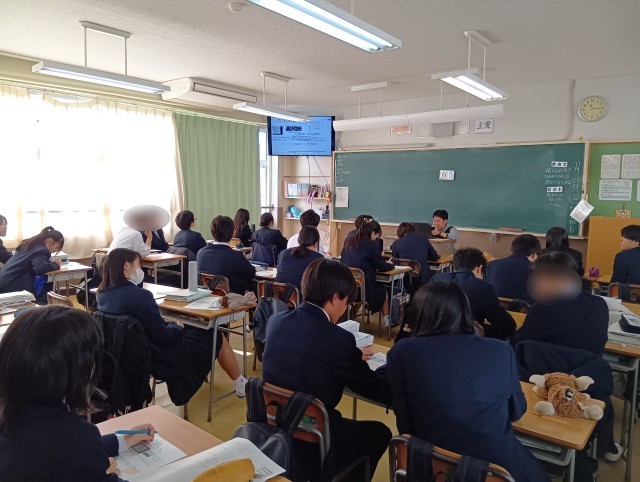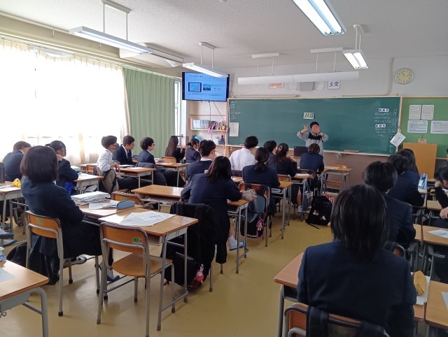 2組 数学 相似な図形のなかの縮図について学んでいました。地図や設計図など身近にあることがらに数学で学ぶ相似があることに気づけるところです。縮尺をもとに計算をして、地図上で見て感じる距離と実際の距離の違いを答えの数値から読み取ることができました。