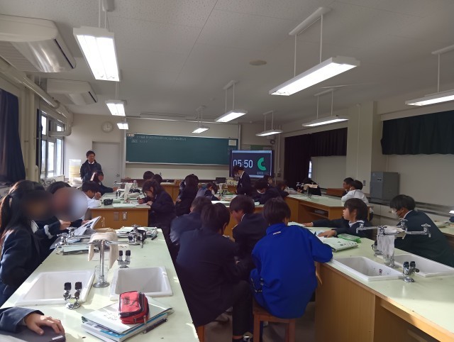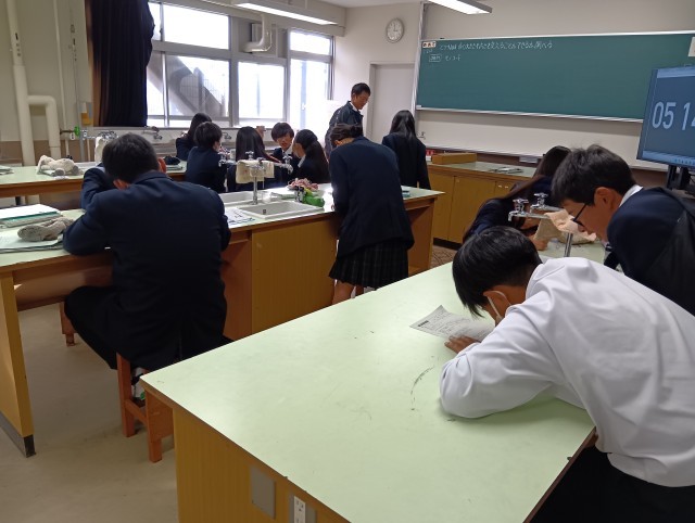 理科 モノコードで「どうすれば音の大きさや高さを変えることができるか」調べる課題にとりくんでいました。班で確認しながらプリントを仕上げていきます。