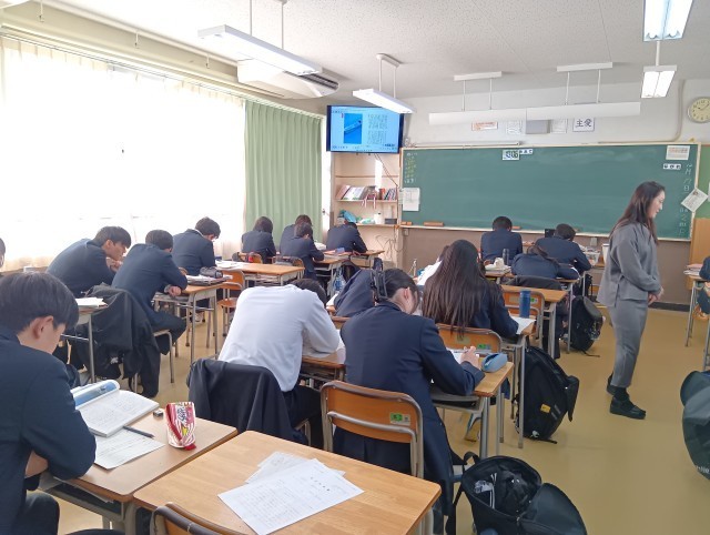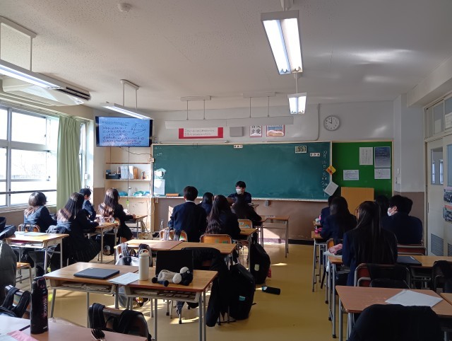 2組 国語 高瀬舟 本文の朗読を聞いています。先生の「ここからしっかり聞いて」の指示に、教科書のその部分にマーカーを引くなど工夫して聞く姿がありました。