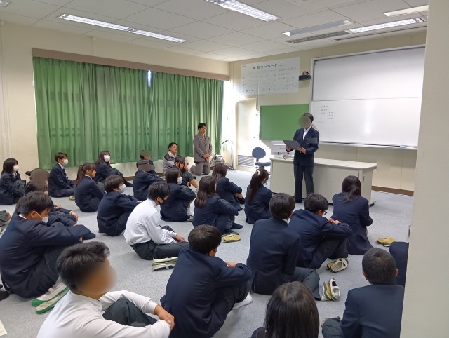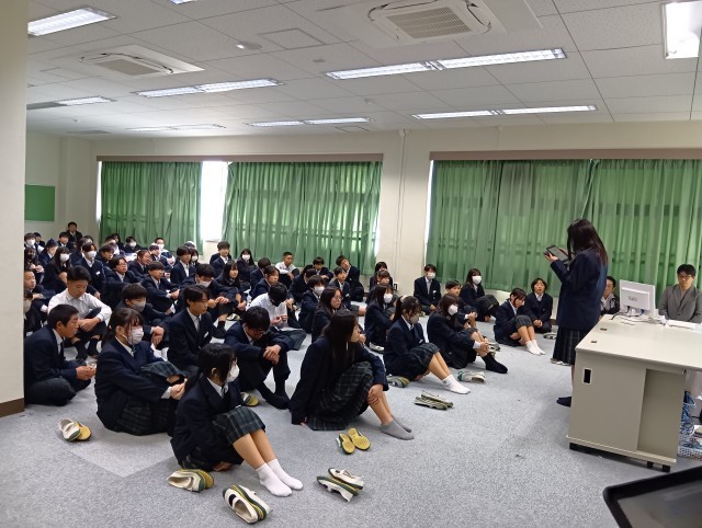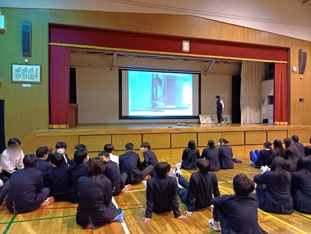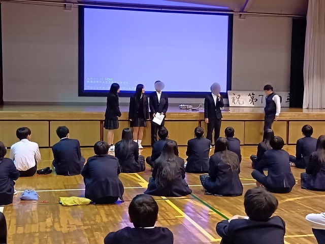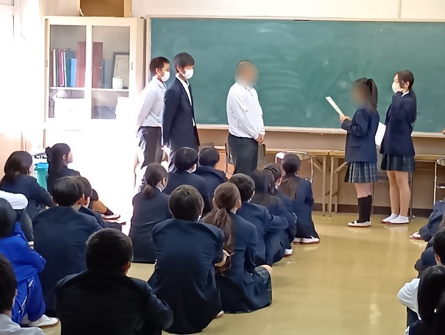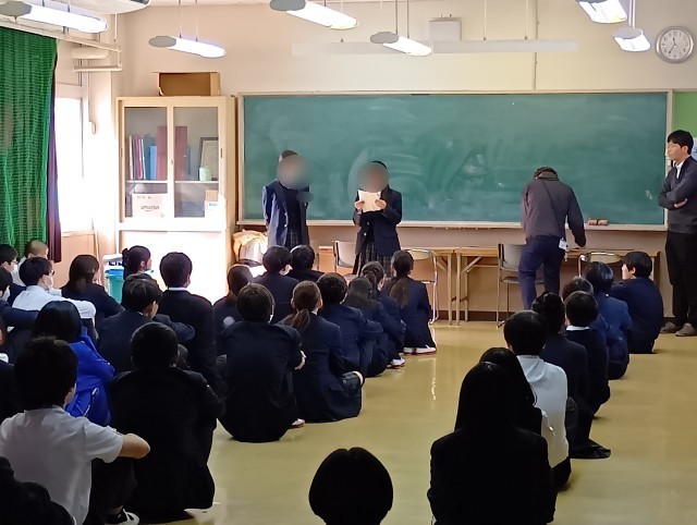 各学級のふりかえりの報告や学年行事での表彰、お楽しみ映像の視聴など生徒が進行する場面や、学年の先生方からのお話を聞く場面などがありました。