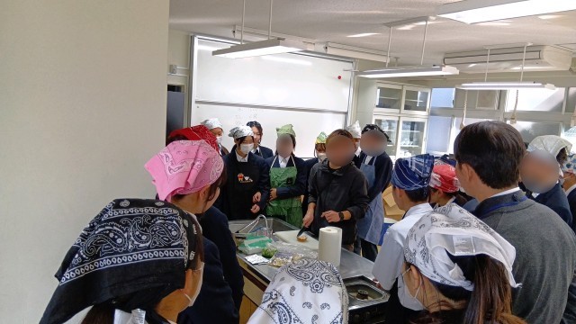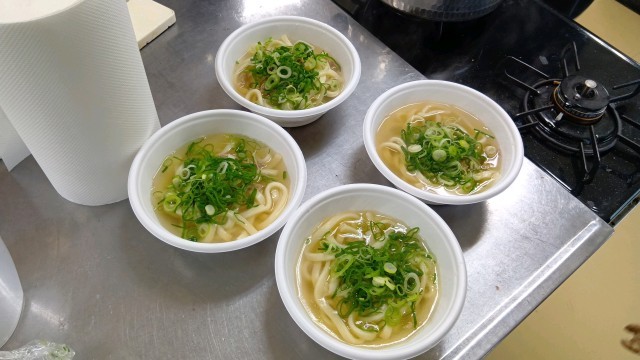 作ったものは「かすうどん」です。調理室へ入るとお出汁の良い香りがしていました。