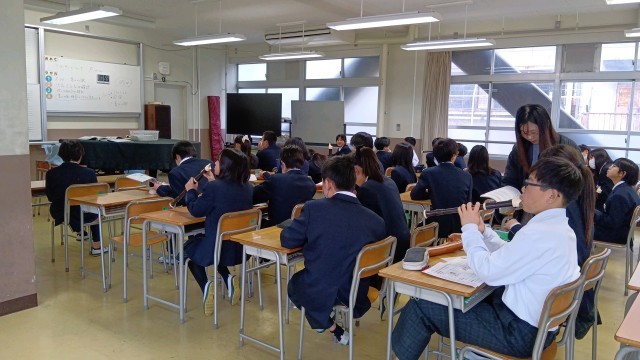 1年生の音楽の授業ではアルトリコーダーで曲の演奏をするための練習をしていました。まずは運指を覚えることろからです。