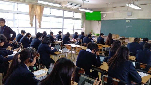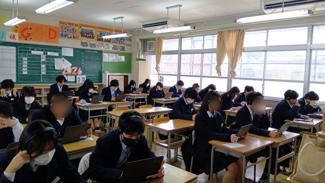 2年生 英語の授業ではCBT、コンピューターを使った試験方式にチャレンジしています。来年の全国学力学習状況調査でもCBT方式で調査が行われるため、事前に体験しておくことも目的の一つです。