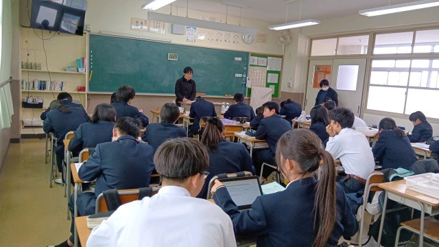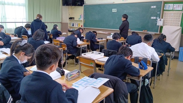 英語の授業では、2月実力テストに向けてこれまでの学習の振り返りを行っていました。ワークやタブレットを自身のやるべきところからとりくんでいました。
