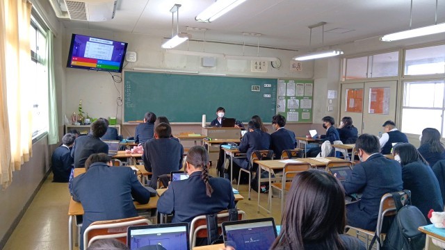 数学の授業はタブレットを使って演習をしています。箱ひげ図に関する内容で、難しい問題もあるのですがクイズ形式で行われているのでスムーズに進んでいきます。重要な部分については先生から解説がありました。