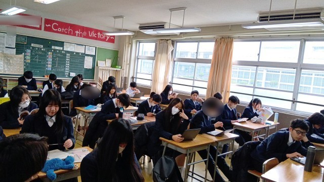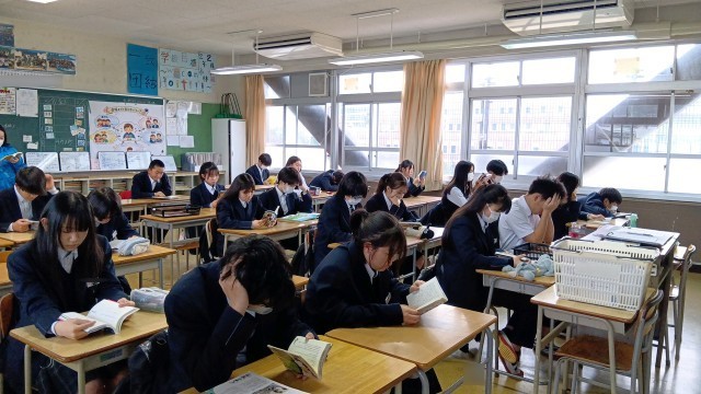 朝、静かな雰囲気で一日がスタートしています。タブレットで電子書籍を読む生徒もいます。