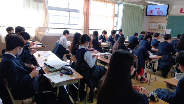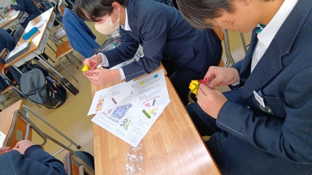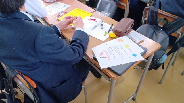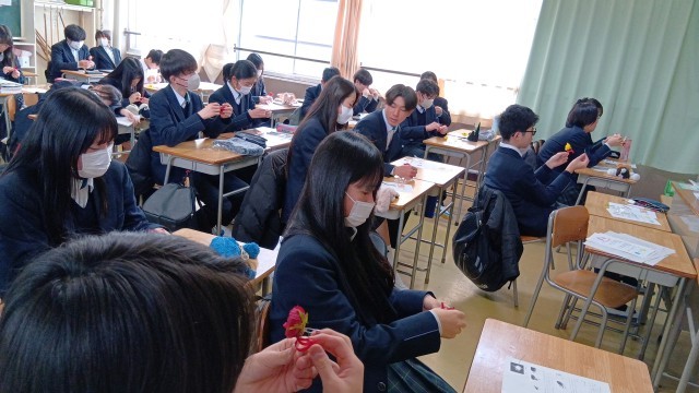 先週金曜日の授業ですが、家庭科でコサージュづくりをしました。