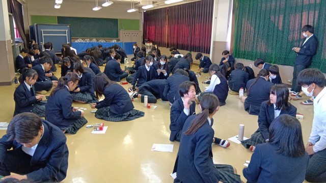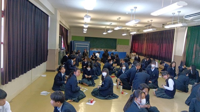 多目的室に3クラスが集まり、グループに分かれて対戦です。