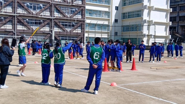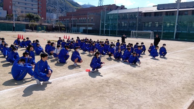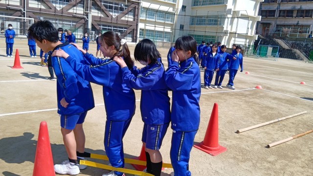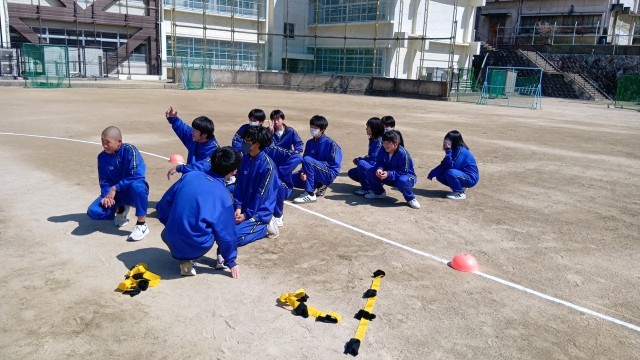 3・4限に学年レクレーションを行いました。はじめはムカデリレーでした。コースにはさまざまな工夫がされていました。