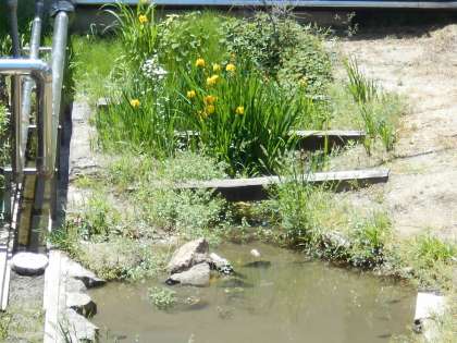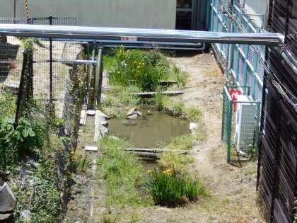 渡り廊下から見下ろしためだか池です。5月14日の様子です。