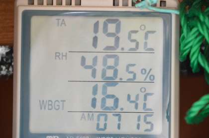 5月15日(金)朝です。晴れ、気温19.5度、湿度48.5%です。過ごしやすい朝です。