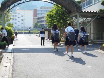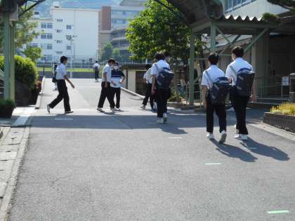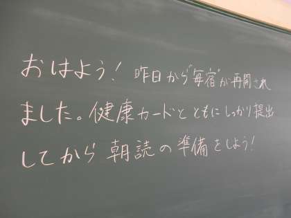 6月9日(火)朝の健康チェックです。登校した生徒は教室に入る前に健康チェックを受けます。「今朝の体温は何度でしたか?」「健康カードは持参していますか?」