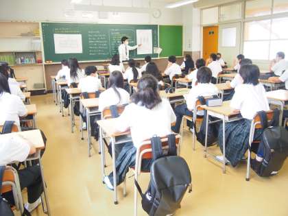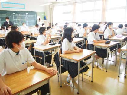 体育館入場前の生徒たちは、教室で入学式の流れの説明を受けています。