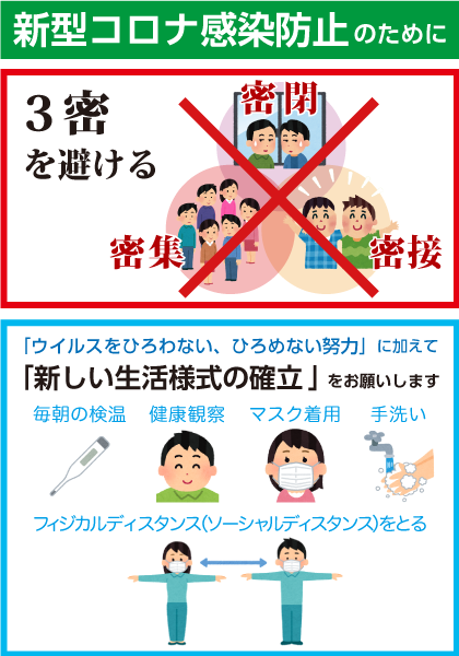 新型コロナウイルス感染防止のために、引き続き「三密(密閉、密集、密接)を避ける」、「ウイルスをひろわない、ひろめない努力」に加えて、「新しい生活様式の確立」をお願いします。