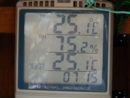 気温25.1度、湿度75.2%、WBGT指数25.1です。