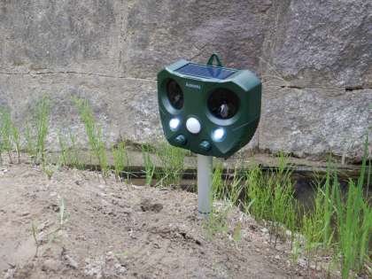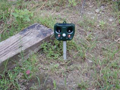 「ソーラー電池式 動物・鳥類 よけ器」なるものを4台設置しました。動くものが近づくとセンサーが反応して、13.5〜45.5KHzの音が出て、LEDライトが点滅するという物です。