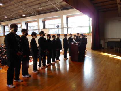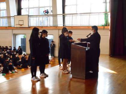 表彰です。文化発表会の作品賞、バドミントン部、男子バスケットボール部です。