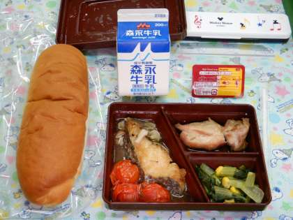 献立表によりますと、本日の給食の「アクアパッツァ」(大おかず)、「鶏肉の香草焼き」(中おかず)、「メープル&マーガリン」がどれも新献立とのこと。