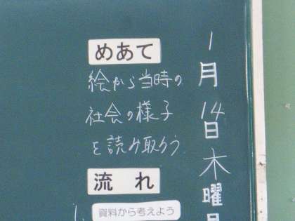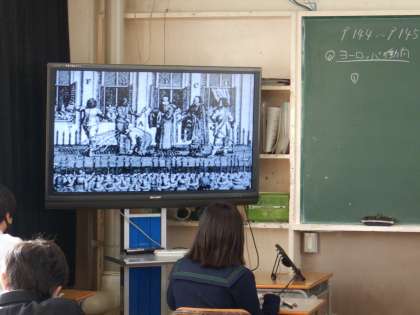 社会です。昔のことが風刺画などで後世に伝えられています。その時いったい何があったのかを考えます。テレビ画面には、王様が処刑されている風刺画が紹介されています。…ん、いったい、何があったんだ!