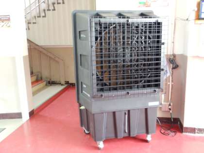 本館玄関のストロングクールです。大型扇風機です。風を送って、強制換気を行っています。水を入れると冷やされた風が出てきます(今は、水を入れていません)。