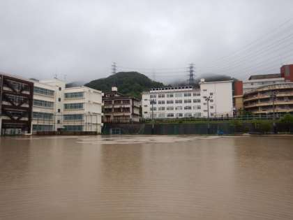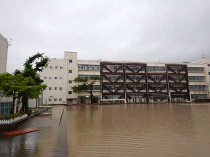 大雨、気温21.1度、湿度99.9%です。大雨・洪水警報発令中。土砂災害警戒情報発令中。場合によっては、近所の方が四条中に避難にくることが考えられます。受け入れます。そして、学校は通常どおり行います。