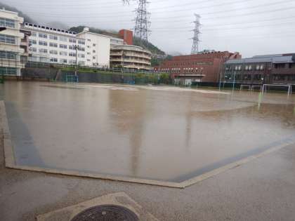 写真のとおり、雨水がたくさんたまっています。たまるように設計されています。グランドに一旦雨水をためて、徐々に排水するようにすることで、近隣の排水があふれないような仕組みです。