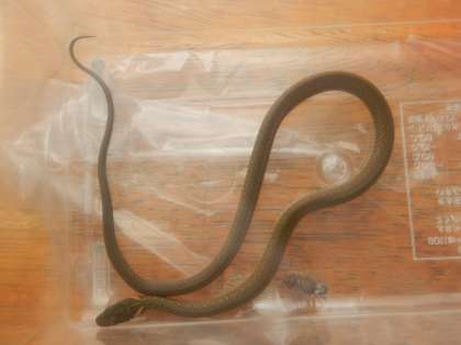 廊下のすみっこに小さなヘビがいました。つかまえました。何というヘビでしょう? 例のアミメニシキヘビではないようですが…。