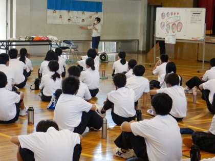 体育館で「いのちの学習」を実施しました。元養護教諭の先生にきていただき、赤ちゃんダッコ体験や妊婦体験などを行いました。