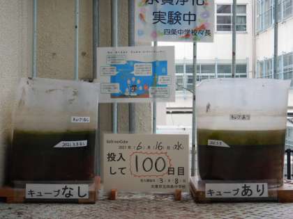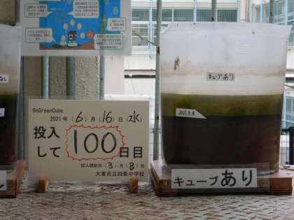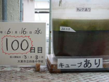 6月16日(水)の実験バケツです。めだか池のヘドロを除去する目的でゴーグリーンキューブを投入しています。投入してから100日が経過しました!