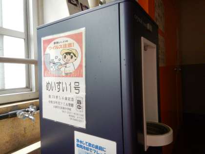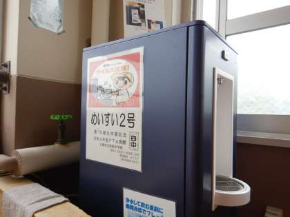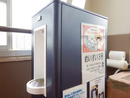 メイスイ株式会社のクリスタルクールです。冷たくて、おいしいお水を給水できています。水筒がカラになっても安心です。ちょっとだけ飲みたいときがあるようで、「紙コップを用意してもらえませんか」とリクエストする生徒がいましたが、自分の水筒か、自分のコップを持ってきておくなどで対応してもらいましょう。