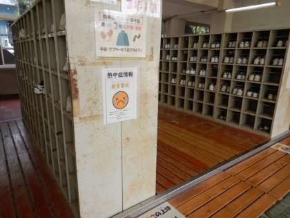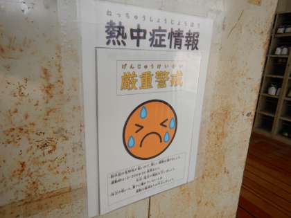 生徒の下足室です。熱中症予防の注意喚起として掲示物を設置しています。本日の熱中症予報が関係省庁から発信されています。それにもとづいた掲示物です。本日は、厳重警戒の日(5段階の上から2番目)ということです。