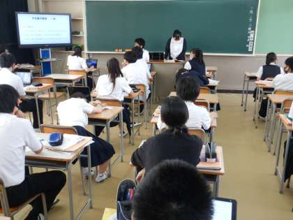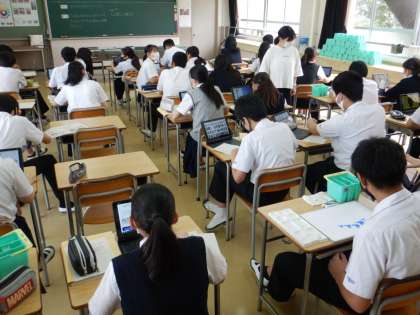 美術、社会です。美術でタブレットを活用しています。社会でタブレットを使って生徒が発表しています。