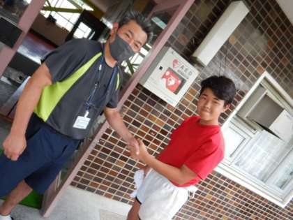 ラグビー部の活動が終わって、校長と握手です。「充実した練習を継続して、強くて、良いチームにしていきます」と決意を語っています。