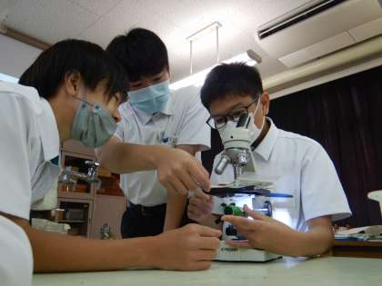 理科です。金魚の尾びれを顕微鏡で観察して血液の流れを確認しています。金魚はめだか池を泳いでいる金魚です。顕微鏡にのってもらいました。めだか池から授業のお手伝いに来てもらいました。
