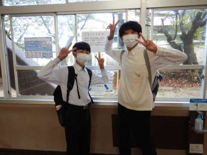 登校したところです。学年が違っても仲良く登校です。学年が違っても、みんなが仲良しなのが四条中の良いところです。