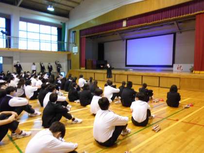 10月25日(月)朝、体育館です。全校生徒集会を行いました。