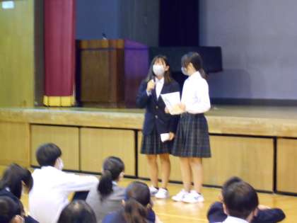 菊葉会役員から「後期菊葉会目標」について、体育委員会から「体育授業時の服装チェック等」について、保健美化委員会から「感染症予防」についての話しがありました。