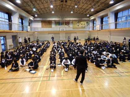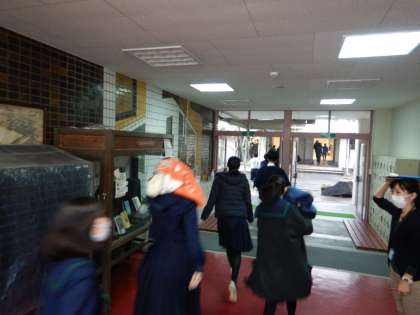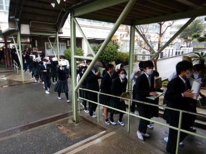 震度5弱以上の地震が発生したという想定で避難訓練を実施しました。避難経路と避難場所の安全を確認してからの移動になります。