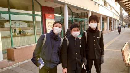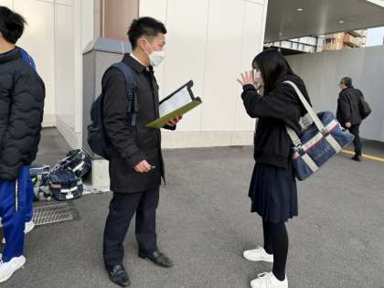 公立一般選抜のために集合場所でチェックを受けています。今日、受検のない友達の見送り(応援)もありました。