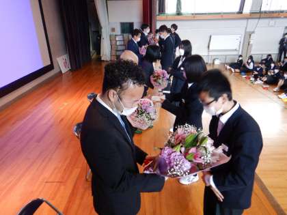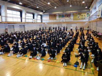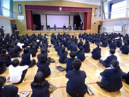 3月まで本校で勤務された方々に来ていただき、離任式を行いました。ご来校いただき、ありがとうございました。これからも四条中学校を見守っていてください。