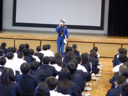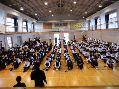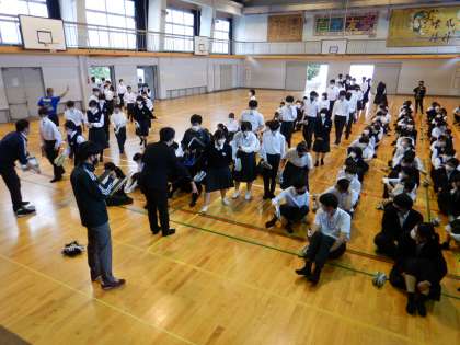 校内で火災が発生したとの想定で、体育館に避難しました。消防署の方から避難で大切なことを教えていただきました。