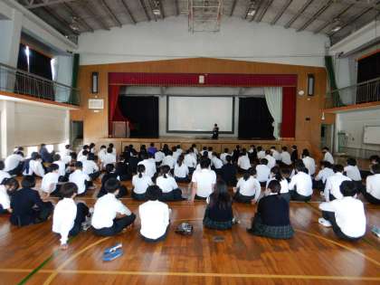 体育館です。来月、沖縄へ修学旅行です。事前学習の映像を見ました。