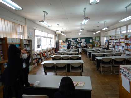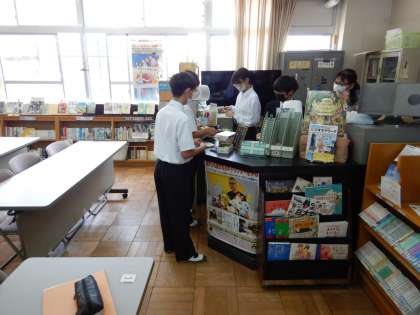 本の貸し出しや返却が行われています。昼休みをくつろいで過ごしています。