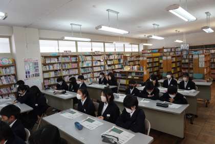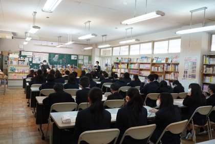 1年1組です。図書室オリエンテーションです。司書の先生から、図書室についてやおすすめの本についてなど説明をしていただきました。図書室をどんどん活用してください。