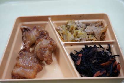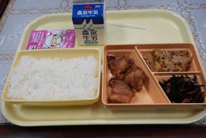 今日の献立は、鶏肉のから揚げ、豚肉とキャベツのみそ炒め、ひじきの煮物、ふりかけ、ごはん、牛乳です。