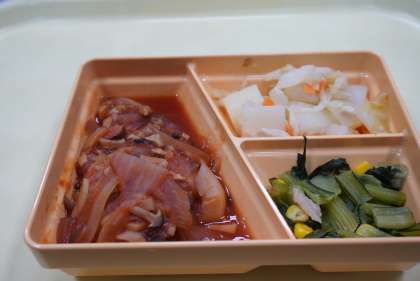今日の献立は、ハンバーグ野菜ソースかけ、ポテトサラダ、小松菜とコーンの炒め物、牛乳です。