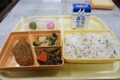 今日の献立は、味の磯部フライ、チンゲン菜とえのきの和え物、牛肉とごぼうの煮物、菜飯、牛乳、花見団子です。