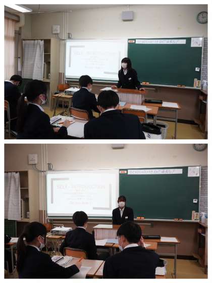 英語の授業です。授業の目当ては「自己紹介のスピーチを全力で頑張る!」です。