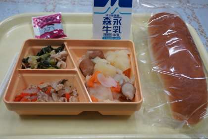 今日の献立は、コッペパン、ポトフ、鶏肉のガーリック炒め、小松菜のサラダ、チョコレートクリーム、牛乳です。